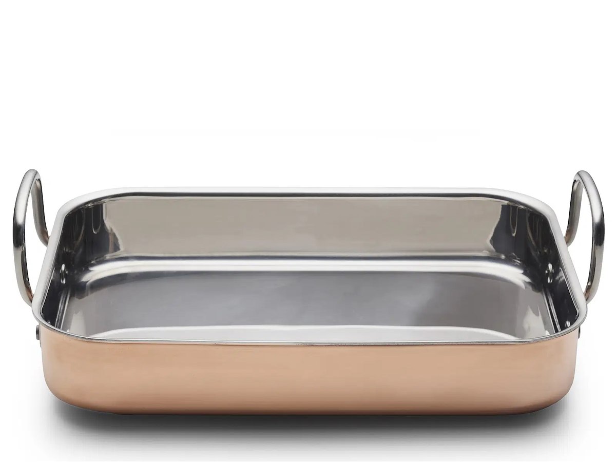 Tidløs, stilfuld og meget funktionel bradepande i kobber og rustfrit stål. Bradepanden er forsynet med håndtag i rustfrit stål. Tåler ovn op til 220 °C. Håndopvask med blød børste og sæbe anbefales. Brug af kobberpudsemiddel vil holde ydersiden blank. Køkkengrej i kobber vaskes op i hånden med varmt vand og opvaskemiddel. Det er en smagssag, om du foretrækker blankpudset kobber eller et mere patineret look. Vi anbefaler, at du pudser dit kobberkøkkentøj inden brug og gentager pudsningen et par gange om året for at holde det flot blankt. Uden pudsning vil kobber med tiden få en naturlig mat overflade med et mindre poleret udseende. Hvis du oplever, at dit kobbertøj bliver meget orangegulligt, kan det skyldes, at kobberet reagerer med luftfugtigheden omkring, og det skal blot pudses for at blive pænt igen.