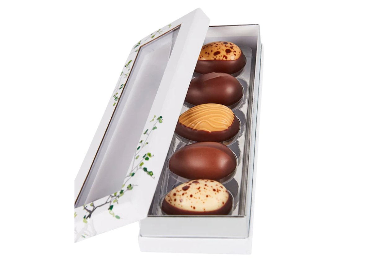 Smuk og elegant gaveæske, fyldt med 5 forskellige varianter af vores raffinerede økologiske påskeæg.