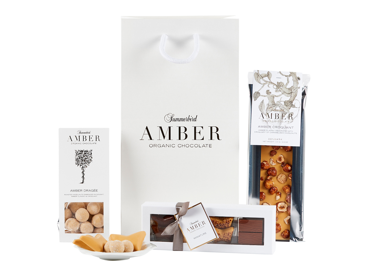 I en elegant og eksklusiv gavepose har vi samlet 4 af vores mest succesfulde Amber-varianter, der alle indeholder Amber Classic-chokoladen.