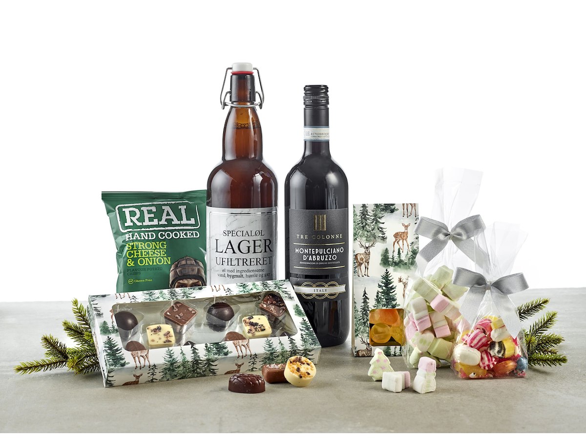 1 fl. Electum, Syrah, Spanien1 fl. Julebock, 100 cl.10 stk. Dansk Luksuschokolade, 100 g.Vingummi, 90 g.Lakridsblanding, 90 g.Snack Attack – BBQ Corn, 35 g.REAL Chips, 35 g.Blåvand Bolcher – Rox, 100 g.