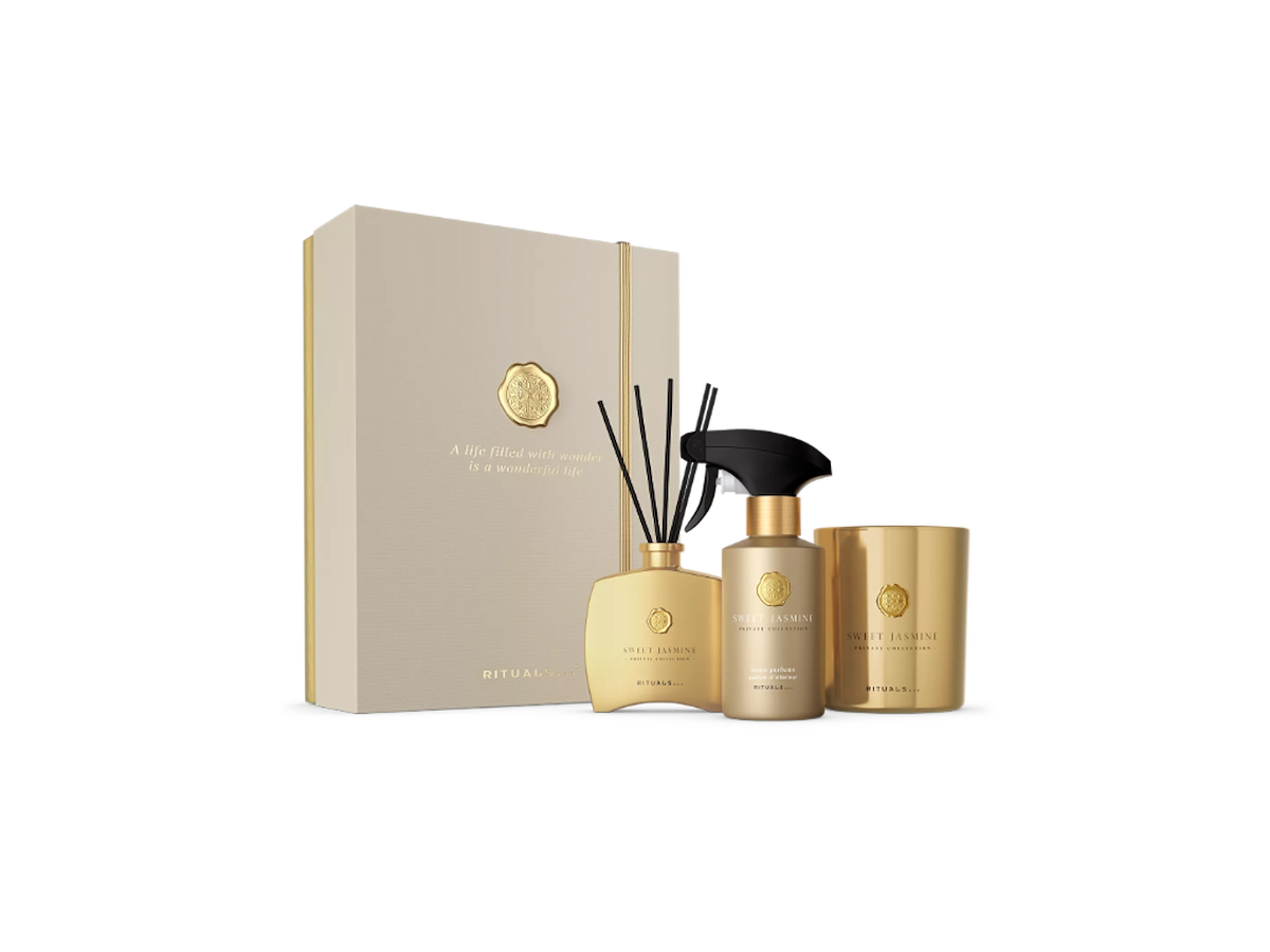 Sweet Jasmine-gavesættet indeholder et duftlys, mini-duftpinde og hjemmeparfume. Den mousserende og livlige frugtagtige topnote af friske citrusnoter og bær fører til elegante blomster som pæon og muguet. Sandeltræ tilføjer elegance og varme til duften.