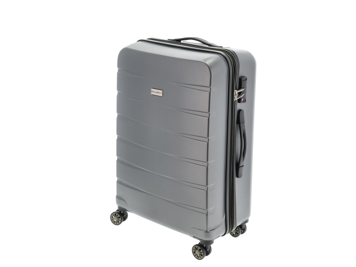 Kabinekuffert med frontlomme til laptop, fremstillet i gråbrun ABS med flot grøn kontrast ved lynlås og på hjul, med lås til begge rum.