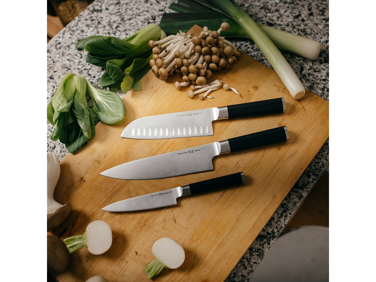 • Fiskars Sensei knive er fremstillet efter stolte knivmagertraditioner og i et moderne design. Knivene er fremstillet i højkvalitetsknivstål med en særligt hård hærdning, som bevarer skarpheden længere. Knivsæggen er poleret i hånden, en metode der giver flot finish og maksimal skarphed.