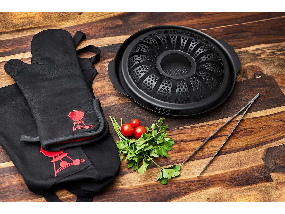 Sættet indeholder: Weber Original stegt-flæsk-holder med bakke, Weber madpincet, Weber grillforklæde og Weber grillhandske.