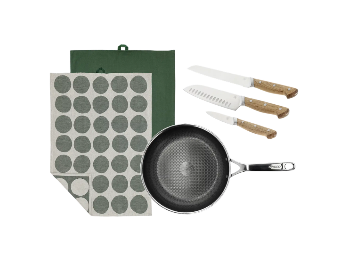 Her får du lidt af det hele på en gang. Du får en 28 cm stålstegepande med keramisk belægning fra Morsøs 79NORD Hybrid-serie, et lækkert Foresta knivsæt med brødkniv, santokukniv og urtekniv med egetræsskaft samt to viskestykker fra Södahl i den smukke Bubbles-serie i farven pine green.