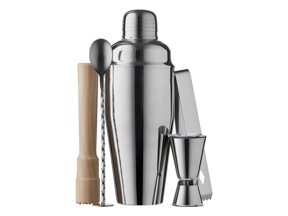 • Lækkert barsæt i rustfrit stål og bøgetræ. Sættet indeholder 700 ml shaker, 19,5 cm røreske, 2/4 cl dobbelt målebæger og istang i rustfrit stål samt 15,6 cm støder i bøgetræ. Ståldelene kan vaskes i opvaskemaskine, mens støderen skal håndopvaskes.