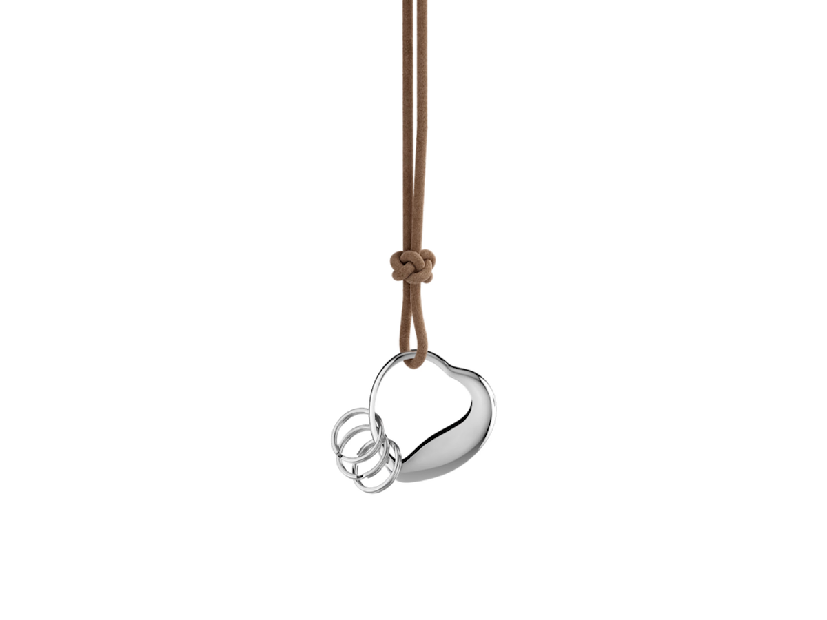 Denne hjerteformede nøglering er udført i blankt rustfrit stål og hænger i en snor af håndknyttet, brunt læder.