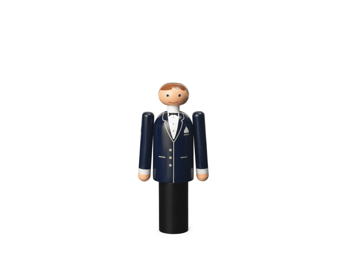 Gommen ligger utrolig tæt op ad Kay Bojesens originale design og er klædt i mørkt jakkesæt med hvid skjorte og sort butterfly.