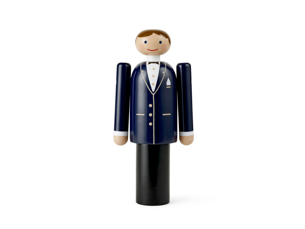 Gommen ligger utrolig tæt op ad Kay Bojesens originale design og er klædt i mørkt jakkesæt med hvid skjorte og sort butterfly.