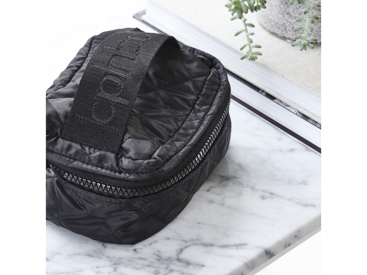 Praktisk info om tasken: Farve: sort Højde: 10,5 cm Bredde: 10,5 cm Længde: 18 cm Materiale: quilt, 98% RPET (genbrugte plastikflasker) Vaskeguide: håndvask 30 grader, hængetørre.