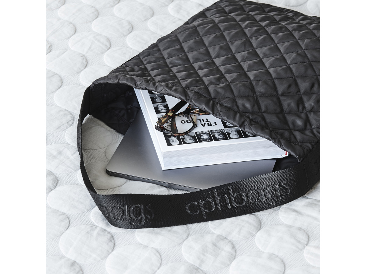 Praktisk info om tasken: Farve: sort Højde: 44 cm Bredde: 40 cm Dybde: 5 cm Skulderremmen er 61 cm lang Materiale: quilt, 98% RPET (genbrugte plastikflasker) Vaskeguide: håndvask 30 grader, hængetørre.