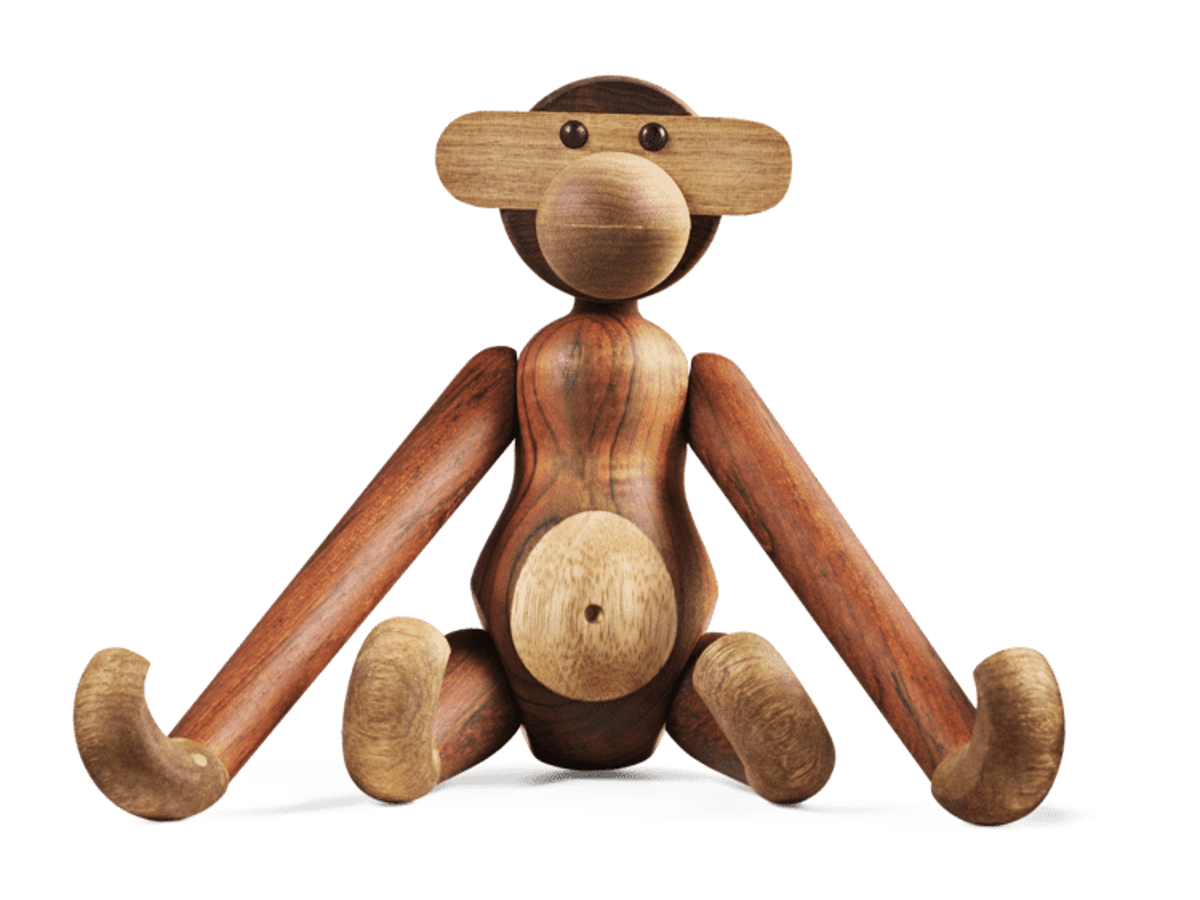 Aben er fremstillet i plantage teaktræ og i limbatræ, og trods sin størrelse har den lille abe selvfølgelig lige så meget karisma og charme som de ældre Kay Bojesen-aber i søskendeflokken.