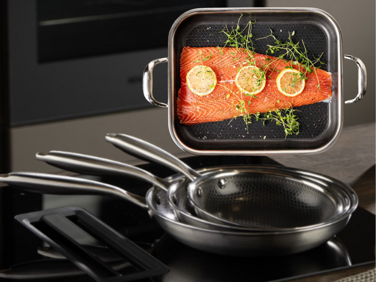Hexa bradepanden i mat rustfrit stål kombinerer æstetik og ydeevne i ét elegant køkkenredskab. Den er udstyret med en keramisk non-stick belægning, der sikrer nem rengøring og jævn varmefordeling, hvilket gør den ideel til både daglig madlavning og mere krævende ovnretter.