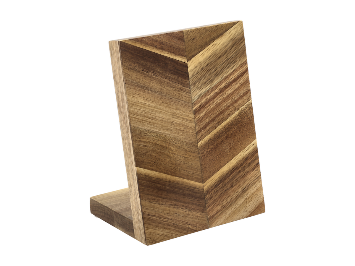 Smuk magnetisk knivblok i akacietræ i sildebensmønster. Den tunge fod sikrer, at blokken står solidt og sikkert på bordet. Knivblokken har dobbelt opbevaringsplads, idet knivene kan placeres på begge sider af blokken.