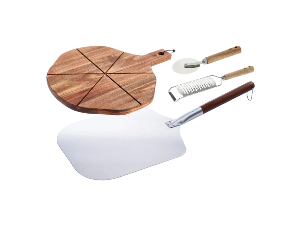 Alle fortjener at få serveret lækker, sprød pizza. Her kommer du et skridt nærmere succes i pizzakøkkenet. Gaven indeholder en stor pizzaspade i aluminium med trægreb, et flot og rustikt serveringsbræt med riller i akacietræ dia. 36 cm, pizzaskærer og groft rivejern i stål og akacietræ.
