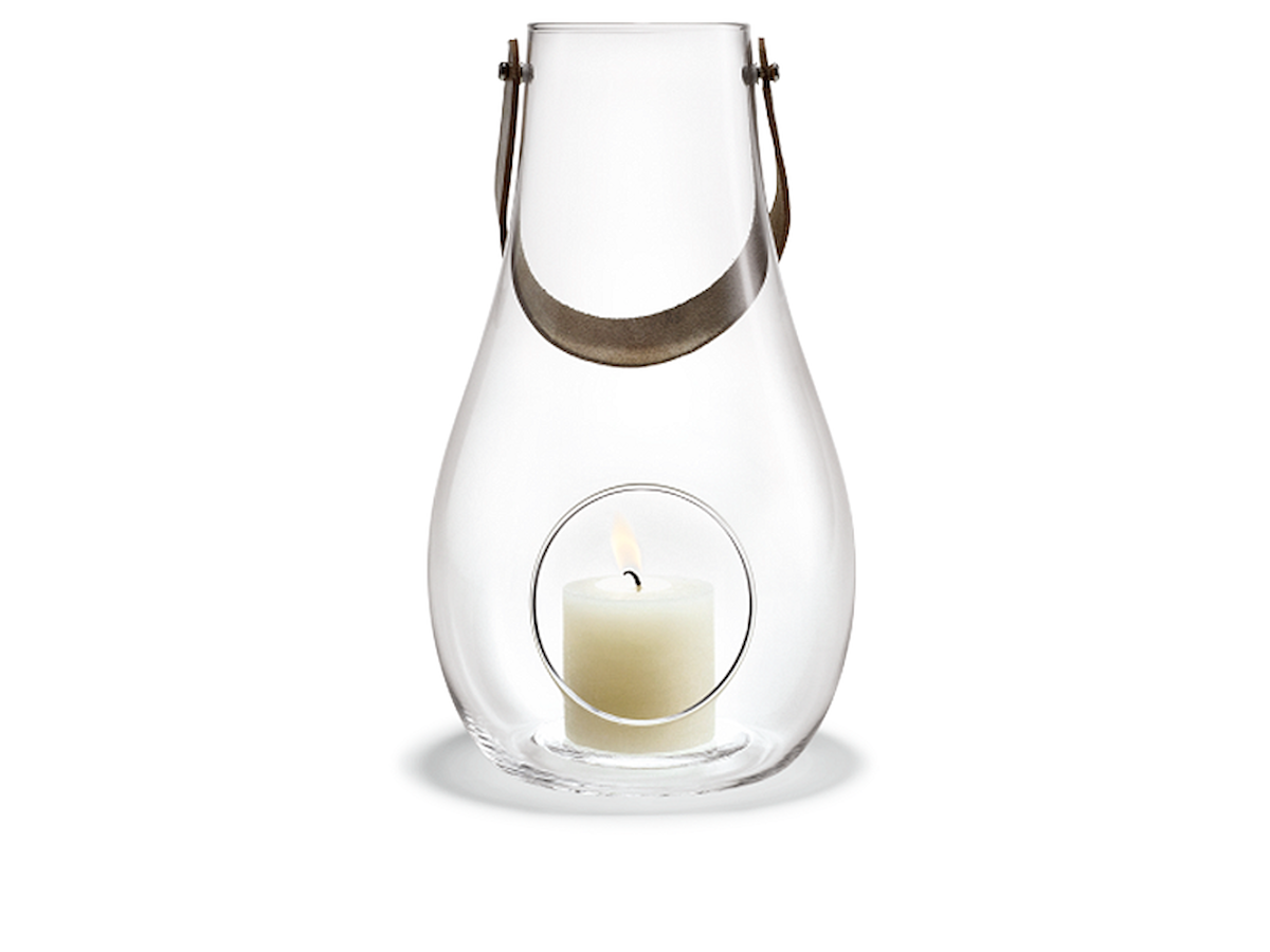 Brug Design with Light lanternen året rundt. Til sommeraftener på terrassen, til dekoration på trappen som velkomst til dine gæster - og som en stilfuld juledekoration tilsat et par kogler, gran og kanelstænger i bunden. Maria Berntsen har skabt den mobile lyskilde i glas og kernelæder til at sprede hygge i skandinavisk stil.
