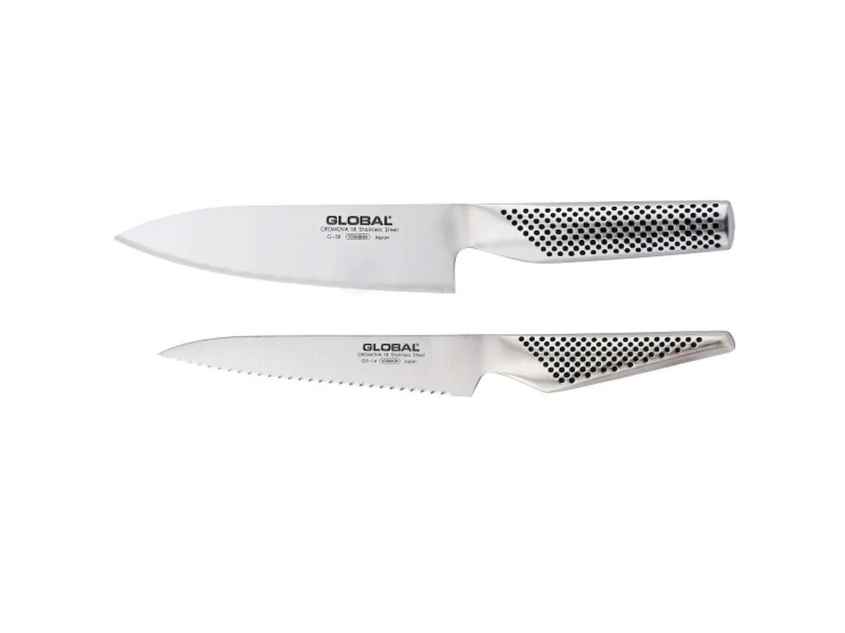 • Global G-58 og GS-14 udgør et alsidigt knivsæt, der kombinerer en kompakt kokkekniv og en mindre allroundkniv. G-58 er perfekt til grøntsager, fisk og kød, mens GS-14 – med sit bølgeskær – er ideel til brød, tomater og citrusfrugter. Knivene er fremstillet i det berømte CROMOVA 18 rustfrie stål, som sikrer langvarig skarphed og høj modstand mod rust. Deres ergonomiske stålhåndtag med prikstruktur giver perfekt greb og balance i hånden.