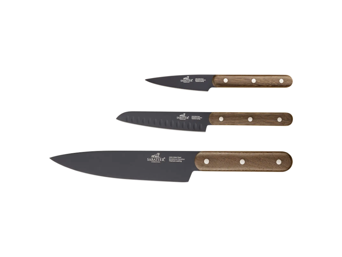 Phenix Walnut knivsæt med tre knive i Lion Sabatiers verdenskendte kvalitet og med håndtag i eksklusivt valnøddetræ. De superskarpe knivblade er skabt af stærkt rustfrit stål (5Cr15MoV) og belagt med titanium. Leveres i fin gaveæske. • 1 urtekniv 9 cm • 1 multikniv med luftskær 13 cm • 1 kokkekniv 20 cm
