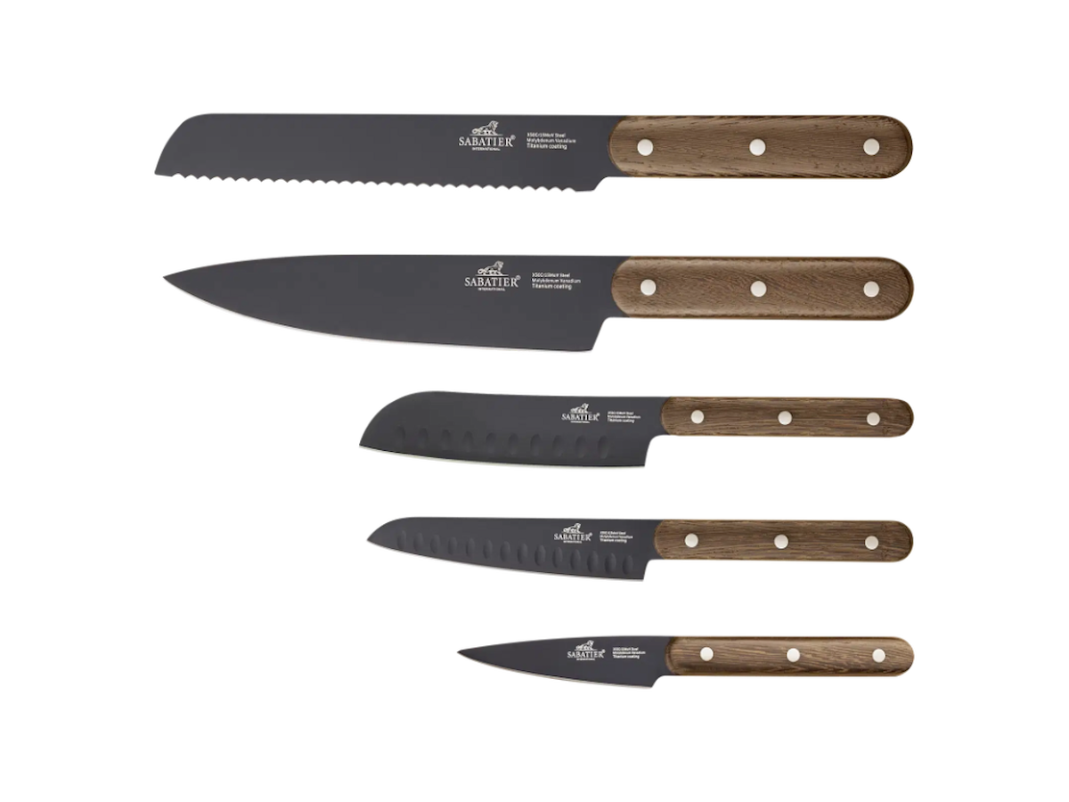 Phenix Walnut knivsæt med fem knive i Lion Sabatiers verdenskendte kvalitet og med håndtag i eksklusivt valnøddetræ. De superskarpe knivblade er skabt af stærkt rustfrit stål (5Cr15MoV) og belagt med titanium. Leveres i fin gaveæske. • 1 urtekniv 9 cm • 1 multikniv 13 cm • 1 minisantokukniv 13 cm • 1 brødkniv 20 cm • 1 kokkekniv 20 cm