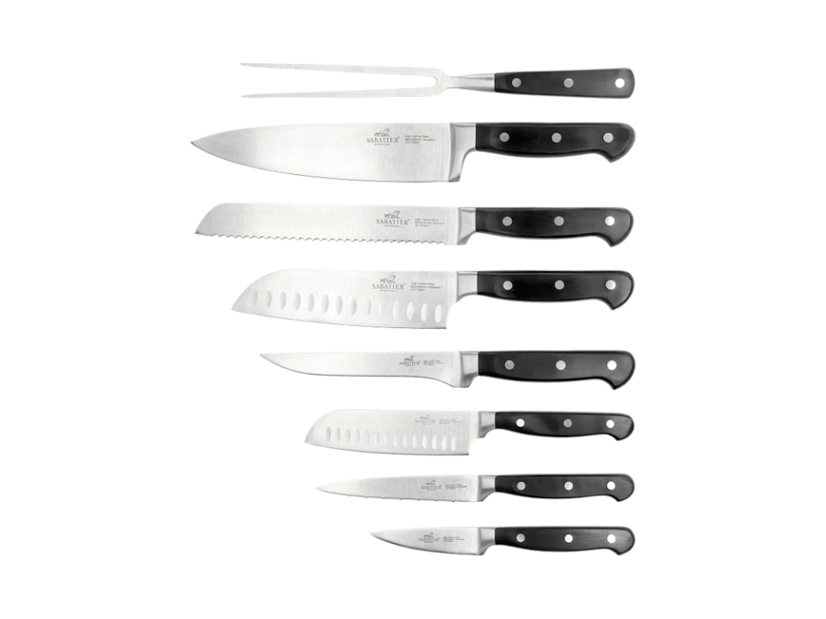 Lion Sabatier Knivsæt 8 dele, urte, tomat, lille santoku, santoku, brød, kokke, udbenerkniv samt stegegaffel i stål/sort, Pluton