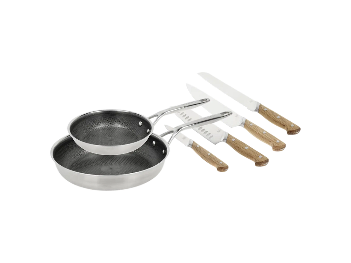 • Denne pakke indeholder to 79NORD Hybrid stålstegepander med keramisk belægning, 20 og 28 cm, og fire lækre Foresta knive med egetræsskaft – brødkniv, santokukniv, kokkekniv og urtekniv.