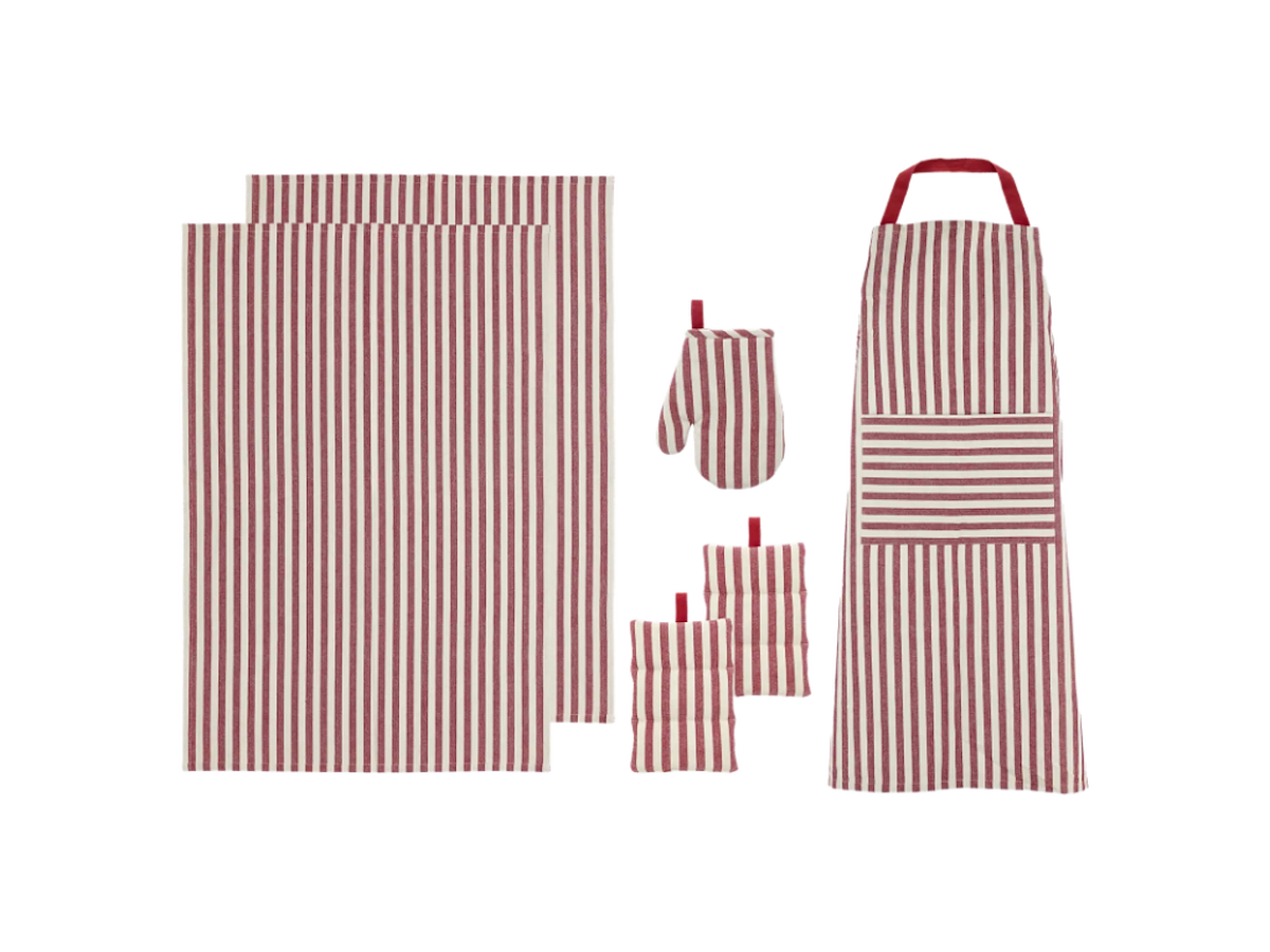 Klassisk og praktisk. Harmony-køkkenserien har et design med stilfulde striber, der aldrig går af mode. Serien er i genanvendt bomuld og passer ind i alle køkkener. Opgradér dit køkken med Harmony-serien, hvor tidløse produkter blandes med omtanke for miljøet. Tekstilsættet i 6 dele i genanvendt bomuld består af forklæde 70 x 91 cm, 2 viskestykker 50 x 70 cm, miniovnhandske 14 x 21 cm og 2 grydelapper 20 x 20 cm. Red.