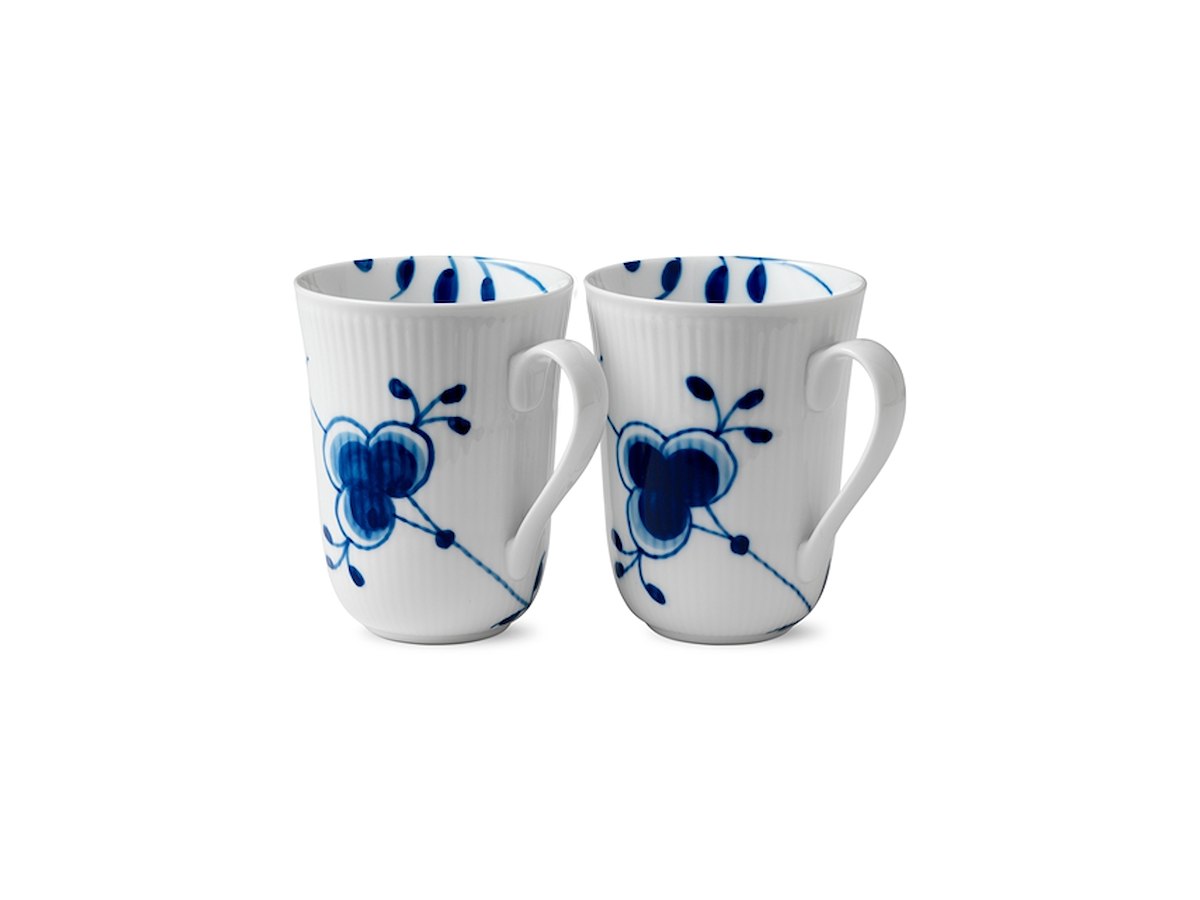 En håndmalet blomst er centralt placeret på midten af disse kopper, mens brudstykker af palmetter draperer top og bund på de to slanke Blå Mega Riflet Krus på 36 cl. Kopperne gør sig godt som tekopper og kaffekopper. Blå Mega Riflet er på en gang velkendt og forfriskende. Stellet er født af en modig nyfortolkning af det ikoniske Musselmalet Riflet og fortryller med sine grafiske og forstørrede sektioner af det musselmalede mønster. Siden Blå Mega Riflet blev designet i 2000 er stellet vokset sig til en ny klassiker inden for dansk design, og det iøjnefaldende stel er smukt i sig selv og i kombination med andre Royal Copenhagen stel.
