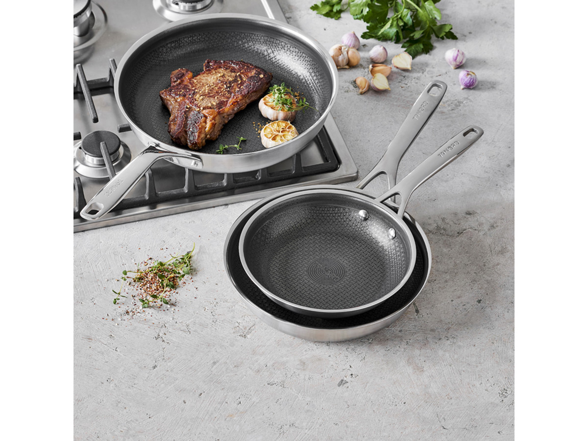Stegning på stålpande Det er anderledes at stege på en pande af rustfrit stål end på en pande med belægning, og netop derfor foretrækker mange professionelle kokke stålstegepander.
