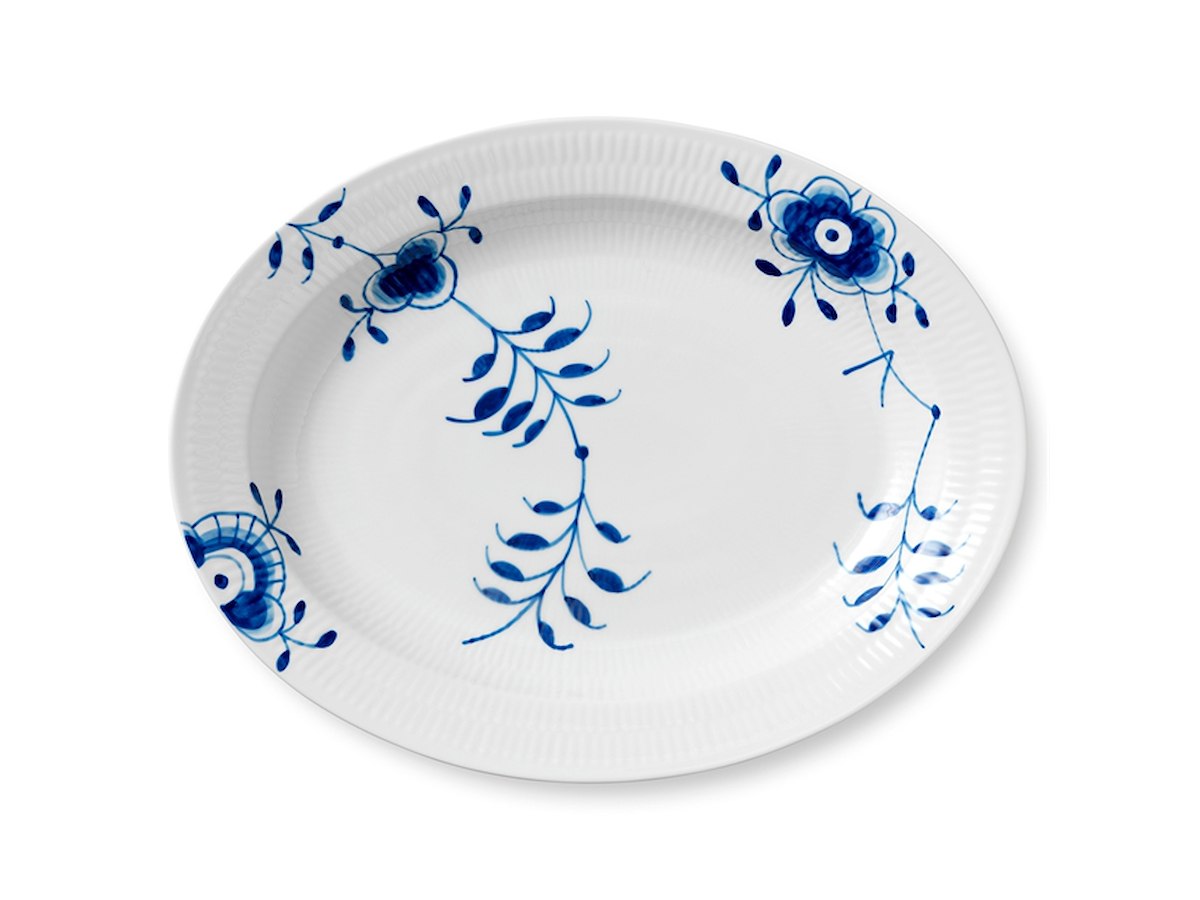 Fadet på 36,5 cm Blå Mega Riflet er håndmalet med stellets iøjnefaldende dekoration. Serveringsfadet kan med fordel kombineres med andre steledele fra Royal Copenhagen i en kontemporær borddækning. Det store fad er ideelt som et serveringsfad til enhver anledning. Blå Mega Riflet er på en gang velkendt og forfriskende. Stellet er født af en modig nyfortolkning af det ikoniske Musselmalet Riflet og fortryller med sine grafiske og forstørrede sektioner af det musselmalede mønster. Siden Blå Mega Riflet blev designet i 2000 er stellet vokset sig til en ny klassiker inden for dansk design, og det iøjnefaldende stel er smukt i sig selv og i kombination med andre Royal Copenhagen stel.