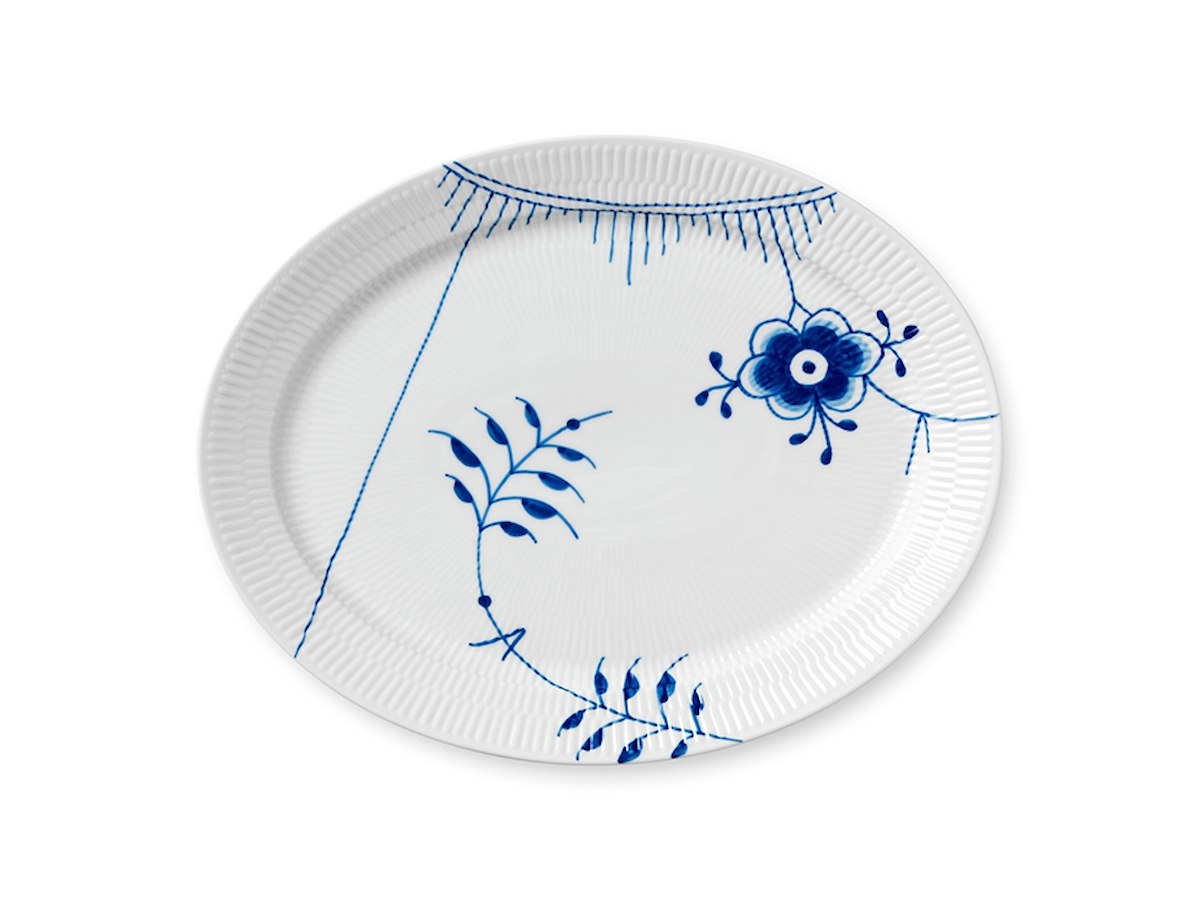 Lav smukke serveringer til hver en tid med dette Blå Mega Riflet ovale tallerken på 35 cm. Tallerkenen er håndmalet i en iøjefaldende komposition af grafiske blomsterdekorationer og stringente linjer, der skaber et kontemporært modspil til fadets ovale form. Blå Mega Riflet er på en gang velkendt og forfriskende. Stellet er født af en modig nyfortolkning af det ikoniske Musselmalet Riflet og fortryller med sine grafiske og forstørrede sektioner af det musselmalede mønster. Siden Blå Mega Riflet blev designet i 2000 er stellet vokset sig til en ny klassiker inden for dansk design, og det iøjnefaldende stel er smukt i sig selv og i kombination med andre Royal Copenhagen stel.