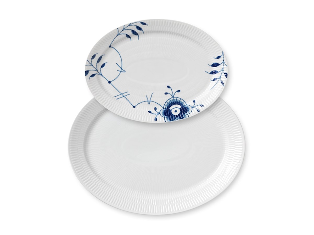 Royal Copenhagen Hvid Riflet fad 34 cm & Blå Mega Riflet fad 28 cm