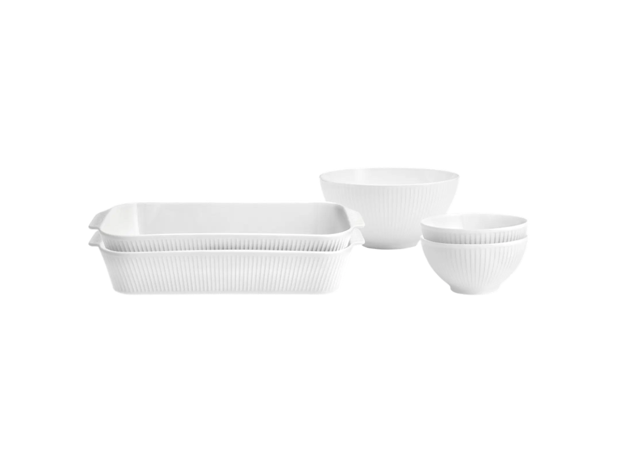 mukt og sofistikeret sæt med to fade og tre skåle til ovnretter, bagning og servering. Sættet består af en 20 cm skål, to 14 cm skåle og to ovnfaste fade på 35 x 19 x 6 cm, alle dele fra serien Plissé.