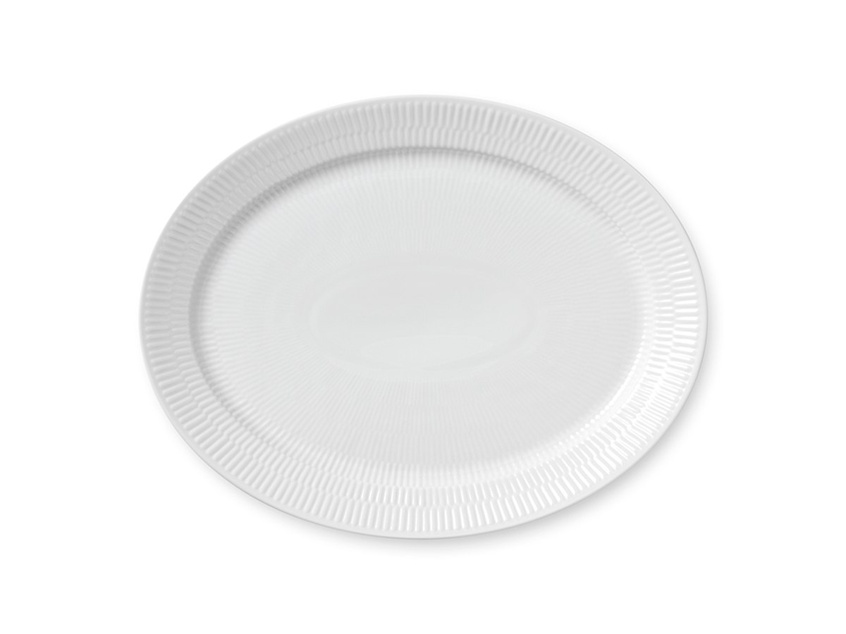Skab er anderledes borddækning med denne Hvid Riflet Ovale Tallerken på 34 cm. Det enkle design af ubemalede rifler skaber et roligt udtryk, der med fordel kan kombineres med håndmalede steldele fra Royal Copenhagen. Den funktionelle tallerken kan også bruges som en steaktallerken eller et serveringsfad. Hvid Riflet er skabt fra grundformen på Musselmalet Riflet og er et stel, der er minimalistisk, ubemalet og evigt klassisk.
