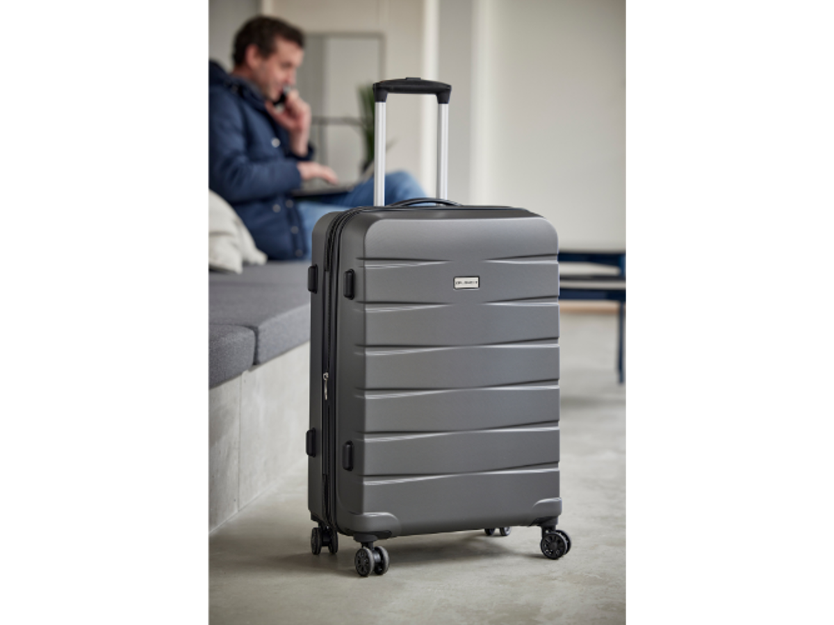 Kuffert med ekspansionslynlås, fremstillet i gråbrun ABS med flot grøn kontrast ved lynlås og på hjul, med TSA-lås og 360 grader dobbelthjul.