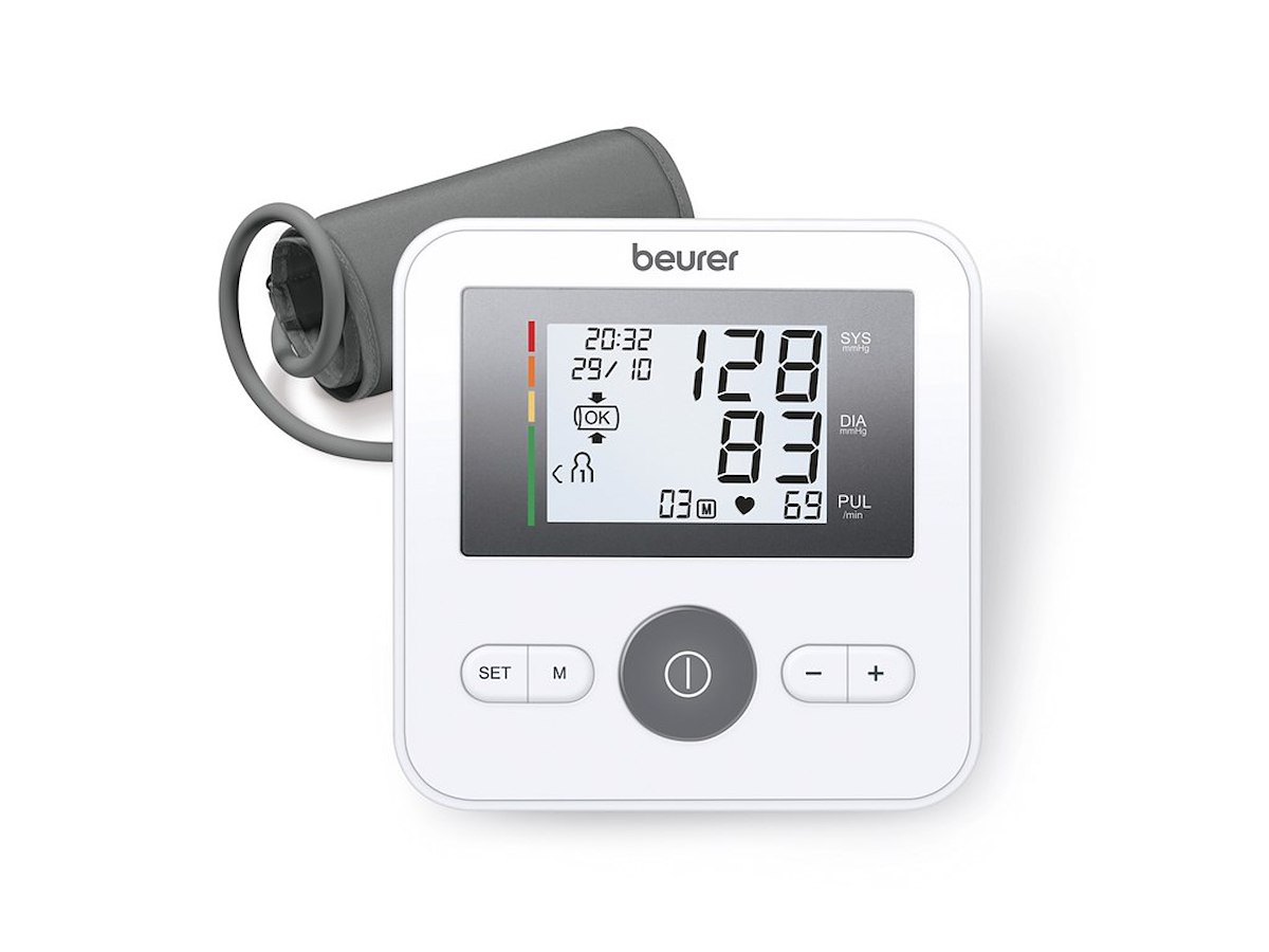 Rigtig god blodtryksmåler til måling af blodtryk og puls på overarmen. Undgå forkerte målinger med manchetpositionskontrol og automatisk indikation ved forkert brug. Fuldautomatisk blodtryk- og pulsmåling på overarmen Letlæseligt display Viser gennemsnit af alle gemte målinger Hukommelse: 30 målinger for op til 4 brugere Klassificering af værdier med farvet skala Arytmi detektor, der advarer i tilfælde af uregelmæssig hjerterytme Guide til manchetindpakning Passer til en overarmsomkreds fra 22 til 42 cm Medicinsk produkt Viser dato og klokkeslæt Automatisk slukning Signal i tilfælde af applikationsfejl Automatisk oppustning og deflation Indikator når batteriet skal udskiftes Opbevaringspose medfølger BM27P har USB-C tilslutning som mulighed