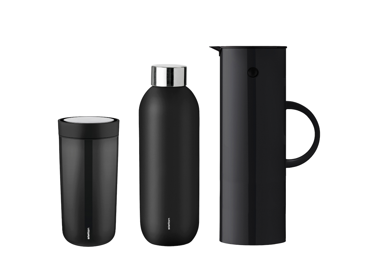 • Den klassiske sorte farve giver produkterne et moderne og stilrent udtryk, mens funktionerne er skabt til hverdagen – hjemme og på farten. EM77 termokanden er designet af Erik Magnussen og er kendt for sit unikke vippe-låg og en kapacitet, der holder drikke varme i timevis. To Go Click koppen og Keep Cool flasken er ideelle ledsagere til både varme og kolde drikke – med 100% tætte låg og moderne funktionalitet.