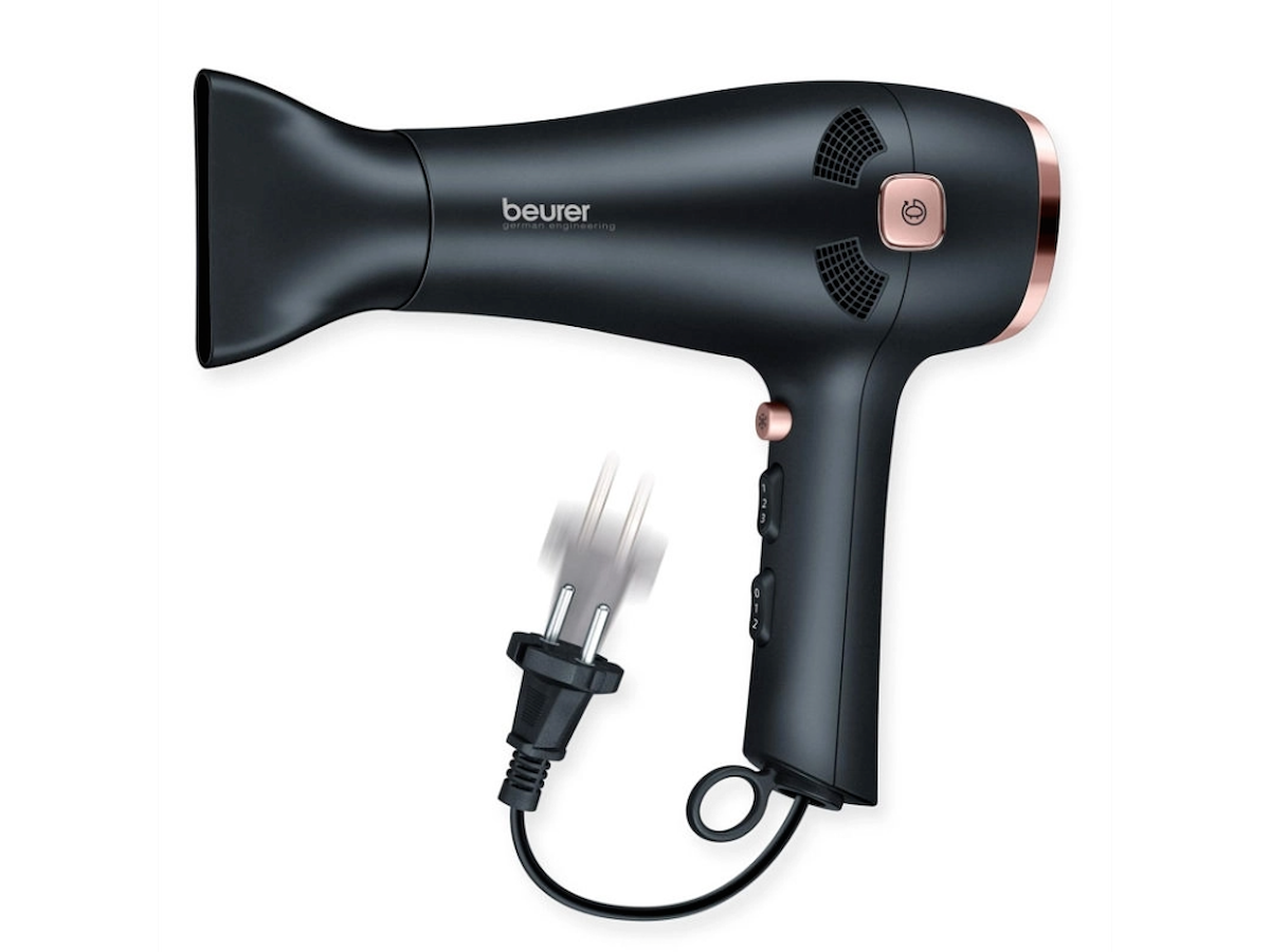 Ionisk hårtørrer fra Beurer. Ionfunktionen er integreret i hårtørreren. Hårtørreren udsender negativt ladede ioner, som resulterer i at håret tørre hurtigere. Derudover vil modvirkes statisk elektricitet. Håret vil også efterlades mere skinnende og blankt, end efter tørring med en normal føntørrer. Føntørren kan let pakkes sammen, da den har kabeloprul. Så skal du ikke tænke på at folde ledningen pænt sammen, inden den skal lægges ned i skuffen eller hænges op. HC 55 har en løkke for enden, så den kan hænges op på en krog. HC 55 har 3 varmeindstillinger 2 hastigheder og koldluftsfunktion. Sikkerhedsfilteret bagpå kan nemt tages af og rengøres. Der medfølger et smalt præcisionsmundstykke og en volume diffuser. Føntørreren yder 2000 Watt på højeste hastighed. Tip! Vidste du at hvis du styler dit hår med en føntørrer, så vil din hårstyling holde i længere tid, hvis du slutter af med at bruge koldluftsfunktionen.