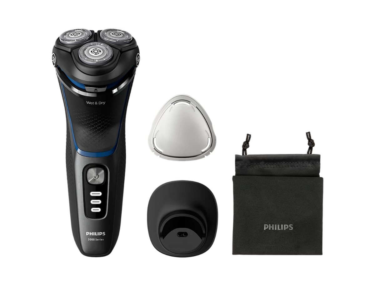 Philips Shaver i 3000-serien Shaver til våd og tør barbering giver en behagelig og effektiv barbering, også på sensitiv hud. Vipbare og fleksible 5D-hoveder, 27 selvslibende PowerCut-knive og mulighed for våd og tør brug sikrer fremragende og pålidelige resulater hver gang. Med vipning og fleksibilitet i fem retninger følger hovedet hver eneste kurve i dit ansigt, så der barberes helt tæt på huden til en glat og behagelig barbering på selv sensitiv hud.