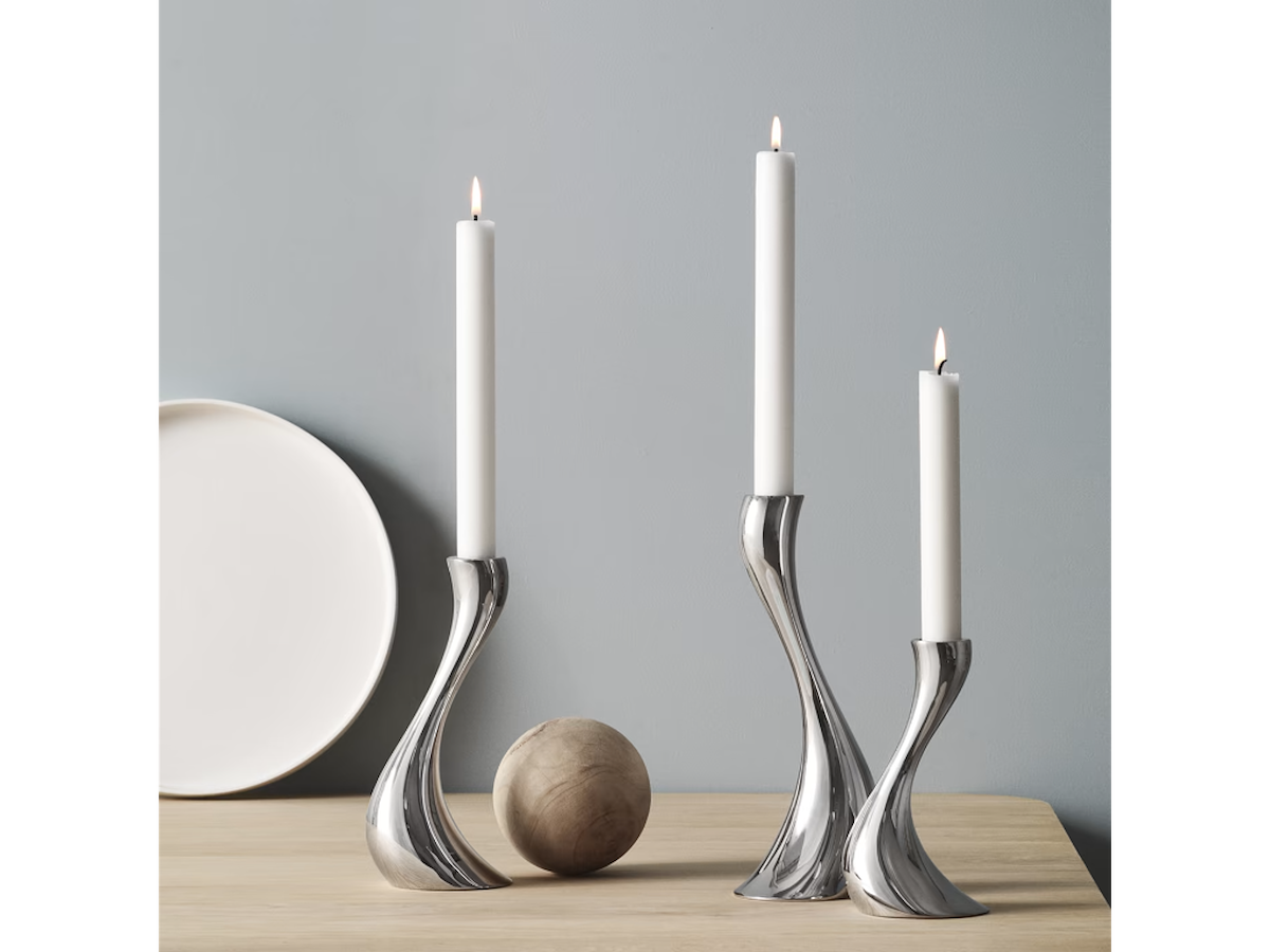 • Lysestagen Cobras bugtede form og drilske look har gjort den til en af Georg Jensens mest elskede og lettest genkendelige produkter. S-formens optiske illusion er let at blive forelsket i, og når dansende stearinlysflammer genspejles i de blankpolerede overflader, er det næsten som om ren magi opstår. Sættet her består af tre lysestager – small, medium og large – der sammen udgør en yndefuldt svajende familie og leder tankerne hen på den sagnomspundne slange, de deler navn med.