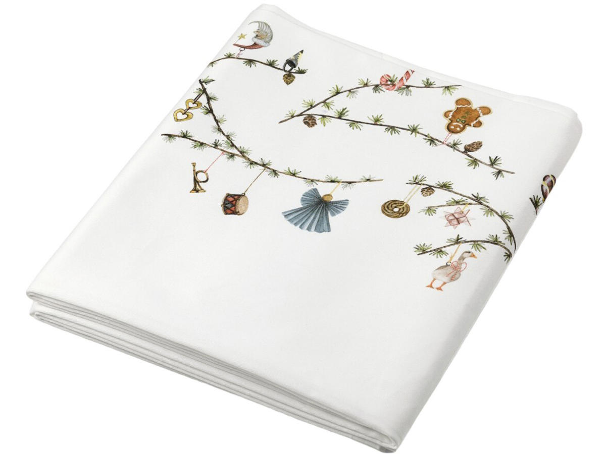 Dugen er dekoreret med nostalgiske jule-elementer som nøddeknækkere, trommer, snemænd og julehjerter, mens den grønne lærkegren skaber en kontinuitet i designet.