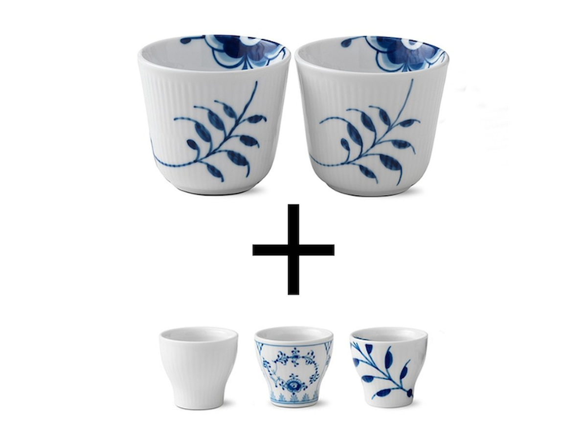 Æggebægerne i Musselmalet Riflet, Blå Mega Riflet og Hvid Riflet fortæller om hver deres særlige periode i Royal Copenhagens historie og komplimenterer hinanden perfekt.