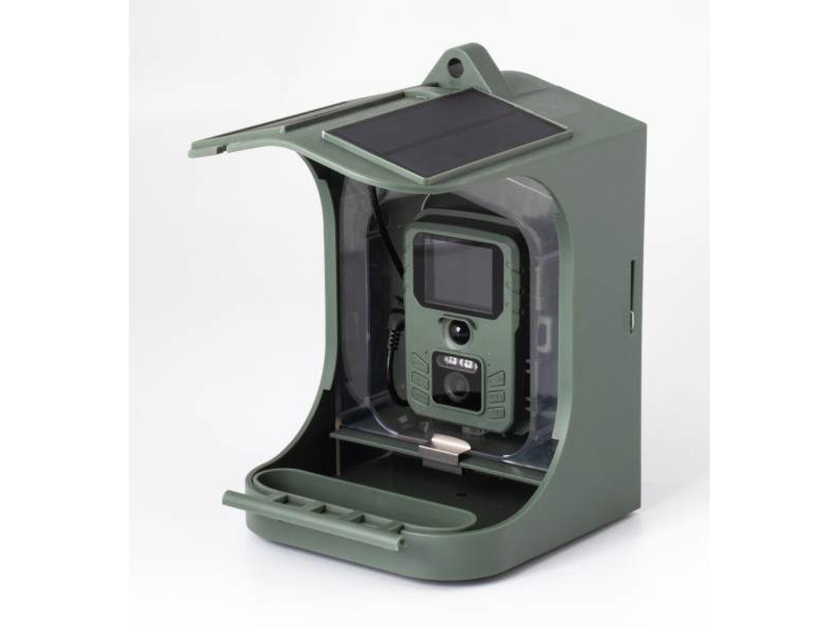 Solcelle panel på taget af fuglebræt, som lader det indbyggede batteri.