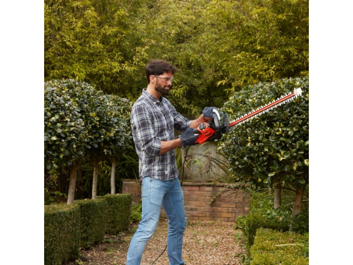 Vil du klippe hækken uden udstødningsgasser, bør du vælge en el-hækkeklipper. Den har en effekt på 600W. Sværdet er langt med sine 60 cm.