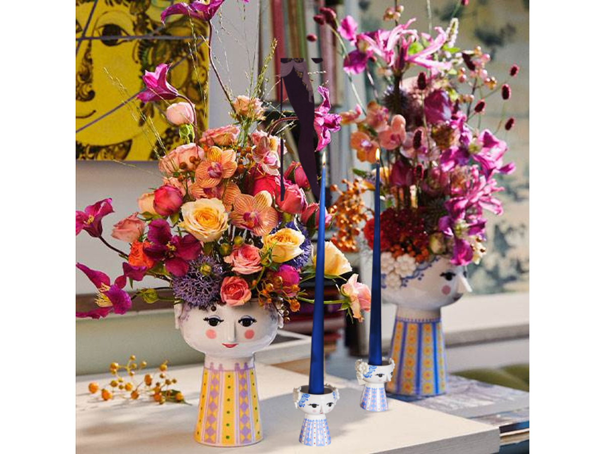 Med sit glade smil, de blussende kinder og farverige dekorationer rummer Eva på alle måder essensen af Bjørn Wiinblad som person og kunstner. Der er noget larger than life over hendes selvsikre, poetiske og drømmende fremtoning, der gør hende til et statement-piece, der fanger øjet i indretningen. Hun både pynter og skaber glæde på bordet, på skænken og på hylden, hvor hun lyser op og gør hverdagen lidt mere farverig – præcis som Bjørn Wiinblad elskede det. Bjørn Wiinblad var en livsglad kunstner med en stor og farverig personlighed, der gik sine egne veje og ikke var bange for at drømme og tænke stort. Den sjæl mærkes også til fulde i Eva, der hviler i sig selv og inviterer os til at udtrykke vores egen stil og personlighed i indretningen med farverige og kreative lysestager. En ting er sikkert: Det bliver ikke kedeligt, når Eva flytter ind. Lysestager med Bjørn Wiinblads Eva – lad kreativiteten lyse