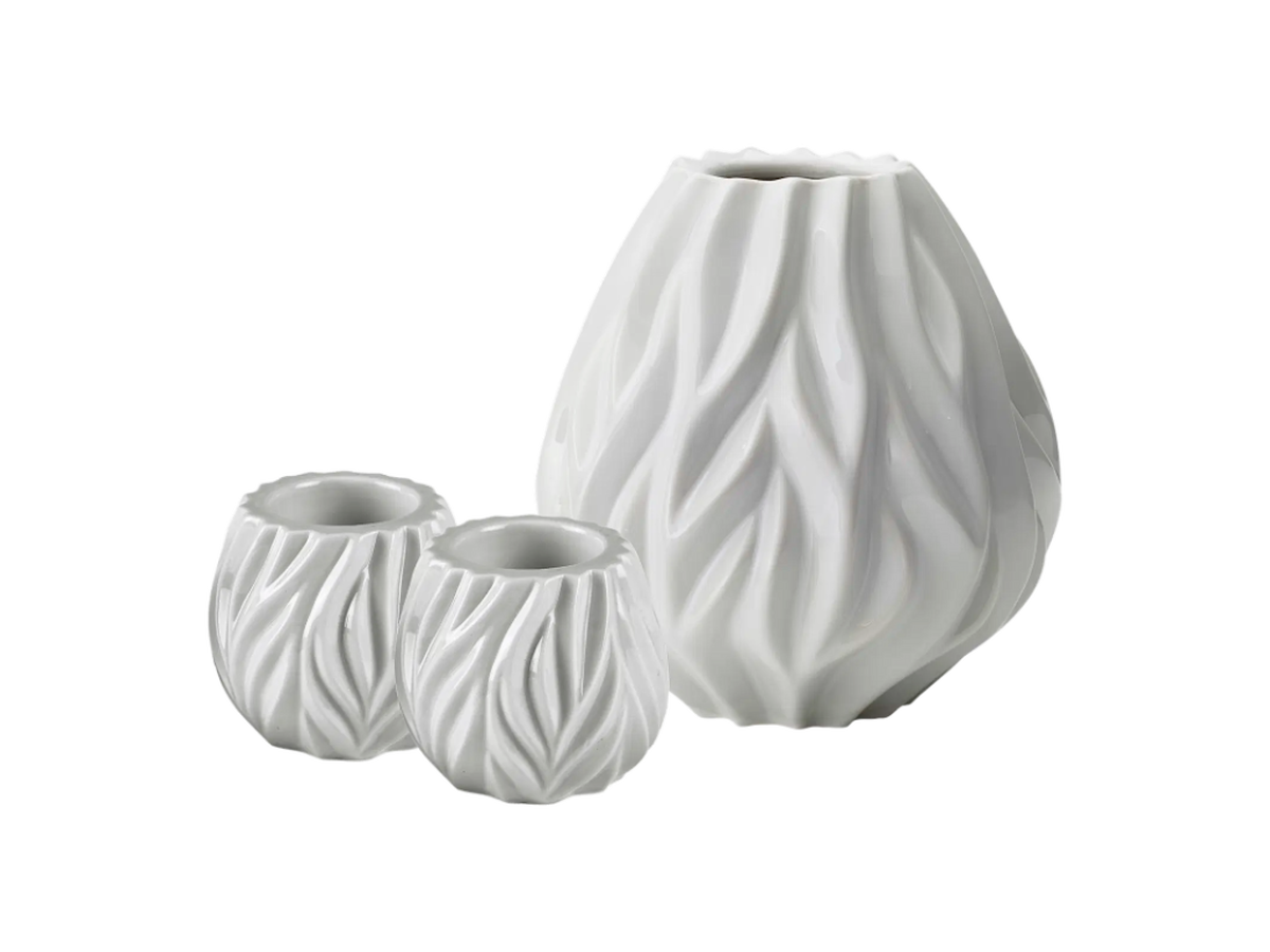 • Flame vase, 19 cm høj, samt et sæt af to Flame fyrfadsstager i samme skulpturelle design som vasen, alle dele i porcelæn med en smuk hvid glasur. Vasens og stagernes organiske mønster leder tankerne hen på ild og flammer.
